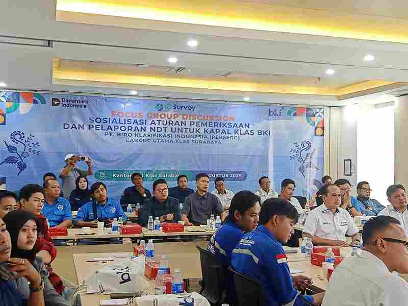 SURABAYA, BERKASNEWS– Biro Klasifikasi Indonesia (BKI) cabang Surabaya yang nota be-nenya adalah badan usaha milik Negara (BUMN) komitmen memajukan dunia maritim Indonesia khususnya bidang perkapalan, hal itu secara konsisten dilakukan perseroan tersebut dengan mengadakan pelatihan maupun menggelar forum group discuccion (FGD),  sebelumnya pelatihan diberikan kepada para nakohda kapal dibanyuwangi tentang bagaimana cara membaca buku pedoman stabilitas kapal, hari ini Senin (25/8/2025) perseroan yang sekarang berkantor di gedung secufindo juga telah menggelar FGD dengan perusahaan NDT company yang jumlahnya 13 perusahaan  atau perusahaan pengukuran tidak merusak untuk kapal, baik pengukuran ketebalan plat kapal  lambung, dek kapal dll ( yang naik dok) maupun hal yang lain misalnya keretakan. Dan yang terpenting perusahaan NDT yang sudah dapat sertifikasi dari BKI.