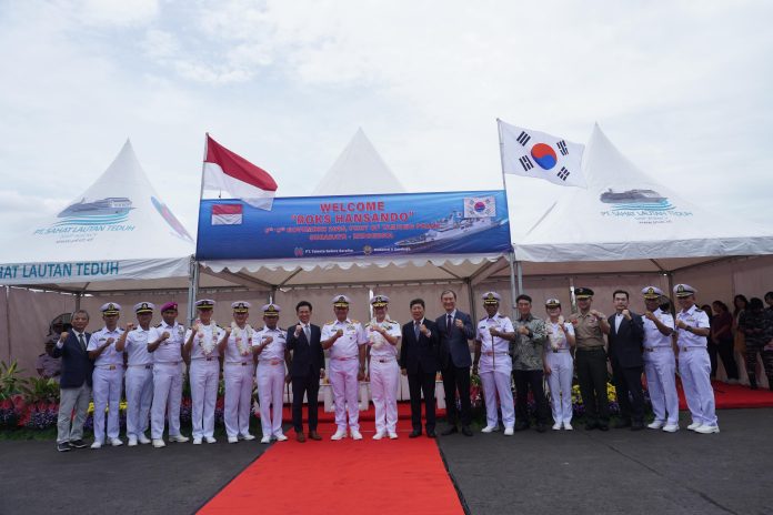 SURABAYA, BERKASNEWS — Kapal perang latih milik Angkatan Laut Korea Selatan, ROKS Hansando (ATH-81) , sandar di Terminal Jamrud Utara, Pelabuhan Tanjung Perak, Surabaya, Kedatangan kapal perang tersebut dalam rangka kegiatan ROK Naval Cruise Training Ship 2025.